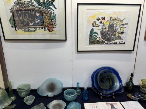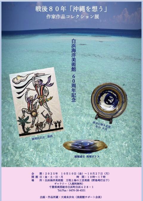 |  先の大戦で、沖縄は多くの県民の命と美しい自然や貴重な文化財を失いました。 生かされた人々は「泣いている暇はない!」と市場を切り開き、 三線を奏で、歌い踊り、手を取り合って、沢山の命をつないできました。 版画家は平和を希求し、作品にその心を彫りました。陶工たちは焼き窯の炎に魂を込め、 ガラス職人は宙吹きガラスに命を吹き込んで、伝統工芸品の復興に尽力しました。 戦後80年、「命(ぬち)どぅ宝(命こそ宝)」の精神で生み出された数々の作品が、 沖縄の青い海を渡り、房州白浜の蒼い海を眼前に現れます。 海のあおさは違えども、平和を願う心はみな同じだと信じています。 美術的に価値の高い、たくましい漁師たちの彩り豊かな万祝をはじめ、海の工芸品が展示される、 千葉県最古の美術館「白浜海洋美術館」開館60周年を記念して。 大城 未沙央  |